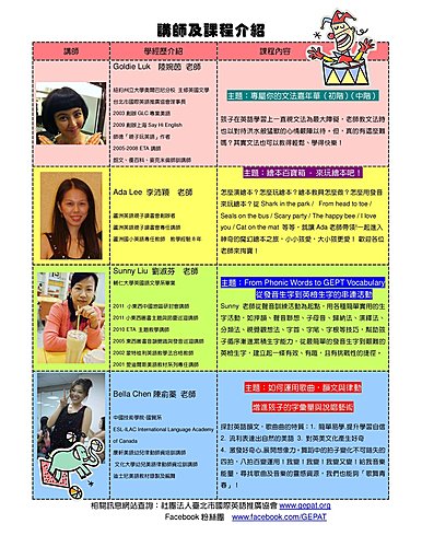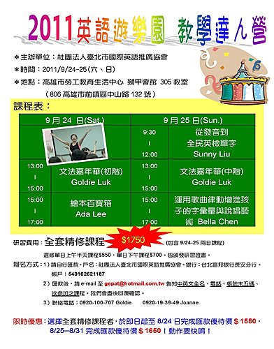 每次參加英語教學研習.都讓我有全新的想法與刺激.不只在教學上有幫助.對於在家教自己的孩子英語也是.所以想要充充電的英語老師們.這次是台北講師南下講課.請把握難得機會!